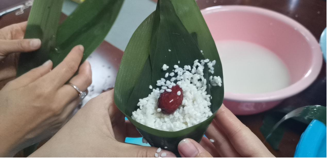 活動(dòng)現(xiàn)場(chǎng)大家圍在桌子周?chē)呆杖~、裹粽子,講述端午節(jié)的故事,言笑嘻怡、其樂(lè)融融,洋溢著節(jié)日的氛圍。