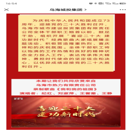 在黨中央確定今年下半年召開(kāi)黨的二十大之后,市城投集團(tuán)公司將喜迎黨的二十大作為2022年思政宣傳工作的重要主線(xiàn),將其貫穿到企業(yè)經(jīng)營(yíng)和生產(chǎn)服務(wù)工作全過(guò)程,組織策劃喜迎二十大系列活動(dòng),先后開(kāi)展市城投集團(tuán)公司“踔厲奮發(fā)新征程,迎接黨的二十大”我們的節(jié)日?中秋主題活動(dòng),組織黨員干部職工觀看紅色影片,組織開(kāi)展“喜迎二十大 建功新時(shí)代”經(jīng)典歌曲大家唱展播活動(dòng),各子公司營(yíng)業(yè)廳、辦公樓等場(chǎng)所張貼懸掛喜迎黨的二十大宣傳標(biāo)語(yǔ)等,進(jìn)一步統(tǒng)一思想、凝聚共識(shí)、匯聚力量,在干部群眾中引起熱烈反響,全面營(yíng)造迎接黨的二十大的濃厚氛圍,以實(shí)際行動(dòng)迎接黨的二十大勝利召開(kāi)。