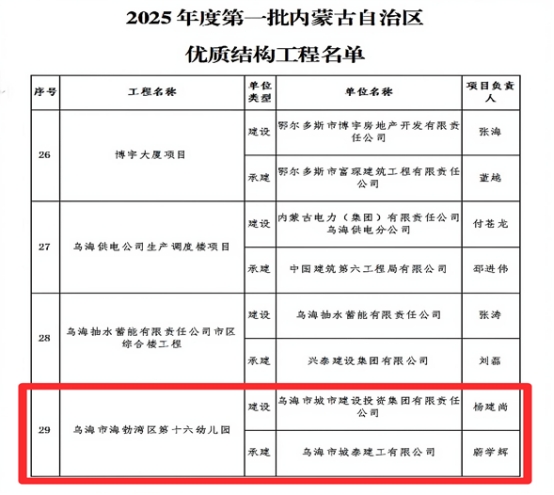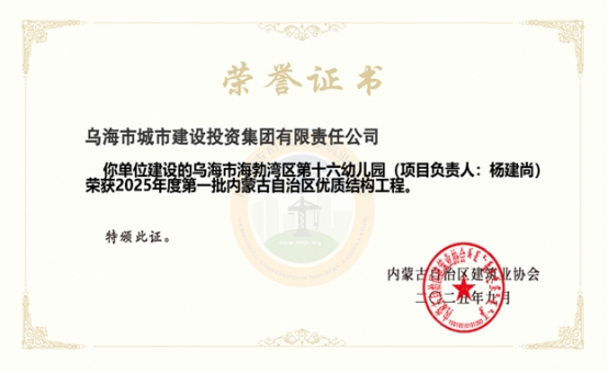 近日,市城投集團公司代建實施的烏海市海勃灣區(qū)第十六幼兒園項目,榮獲2025年度第一批內蒙古自治區(qū)優(yōu)質結構工程。