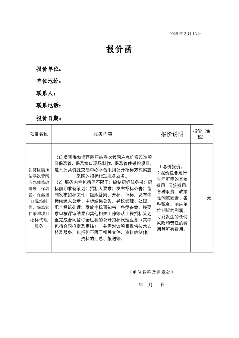 勃灣區(qū)隔壓站零次管網(wǎng)應(yīng)急維修改造項(xiàng)目保溫管、保溫接口現(xiàn)場制作、保溫管件采購項(xiàng)目招標(biāo)代理服務(wù)【招標(biāo)公告】